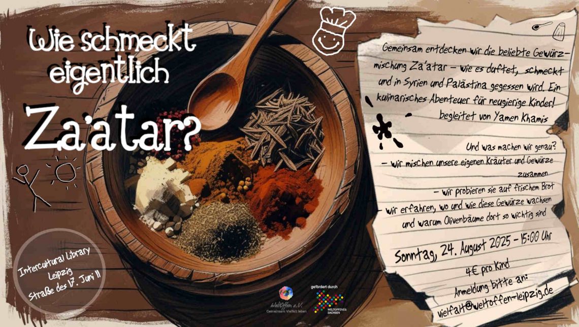 Gemeinsam entdecken wir die beliebte Kräuter/Gewürzmischung Za’tar – wie es duftet, schmeckt und in Syrien & Palästina gegessen wird! Wir mischen unsere eigene Kräuter und Gewürze zusammen, probieren sie auf frischem Brot und erfahren, wo und wie wachsen diese Gewürze und warum Olivenbäume dort so wichtig sind. Ein kulinarisches Abenteuer für neugierige Kinder!Sonntag, 24. August 2025 um 15:00